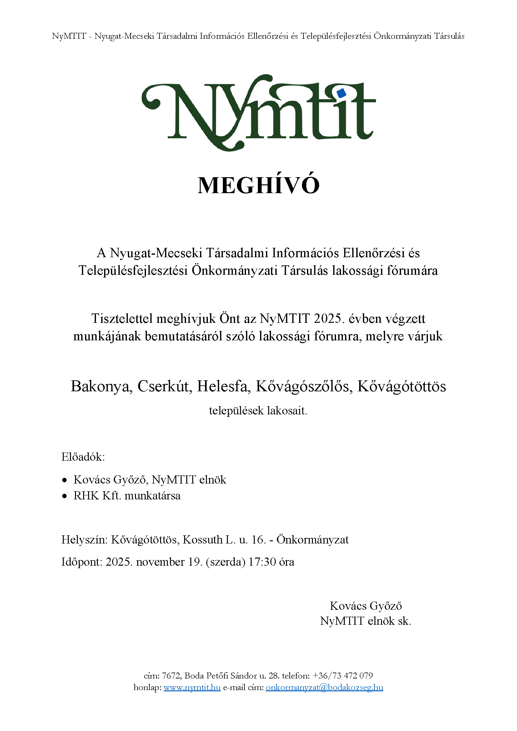 Tisztelettel:  Kovács Győző NYMTIT elnök